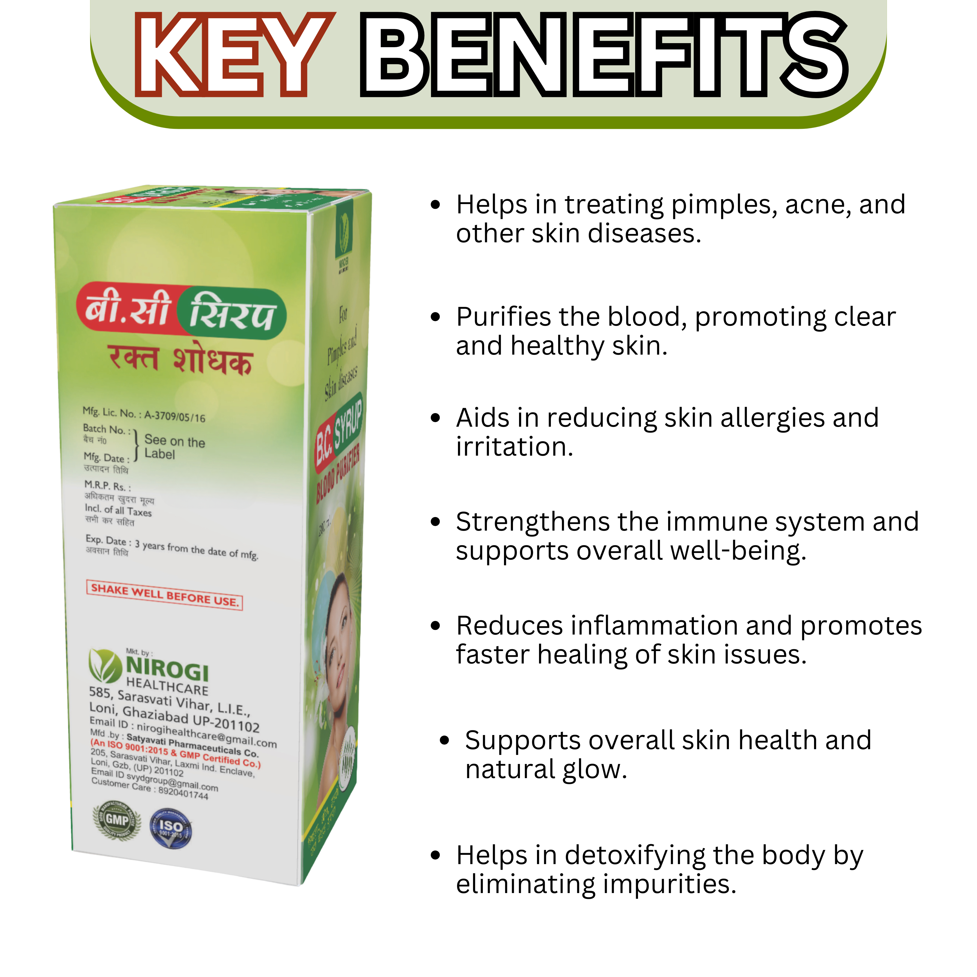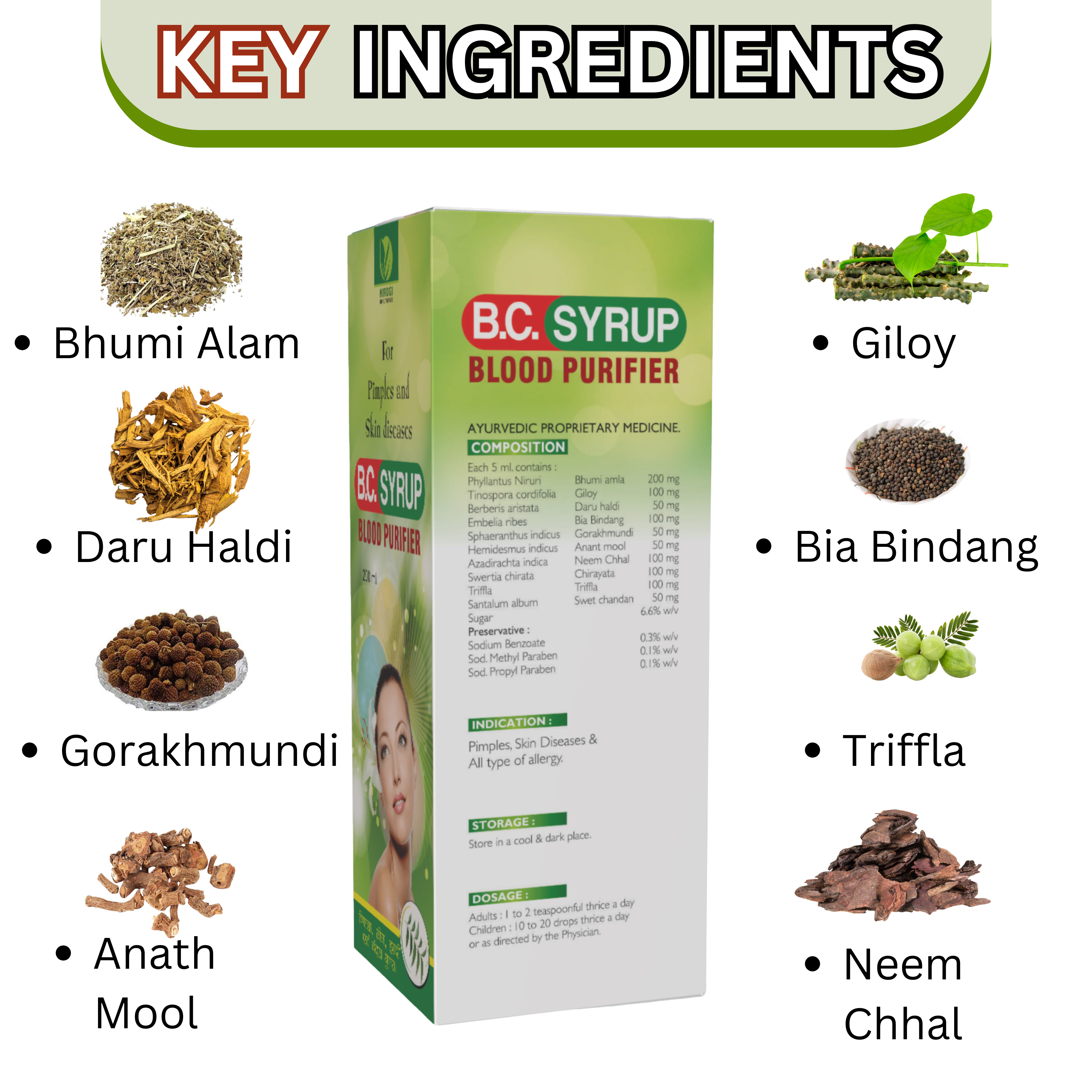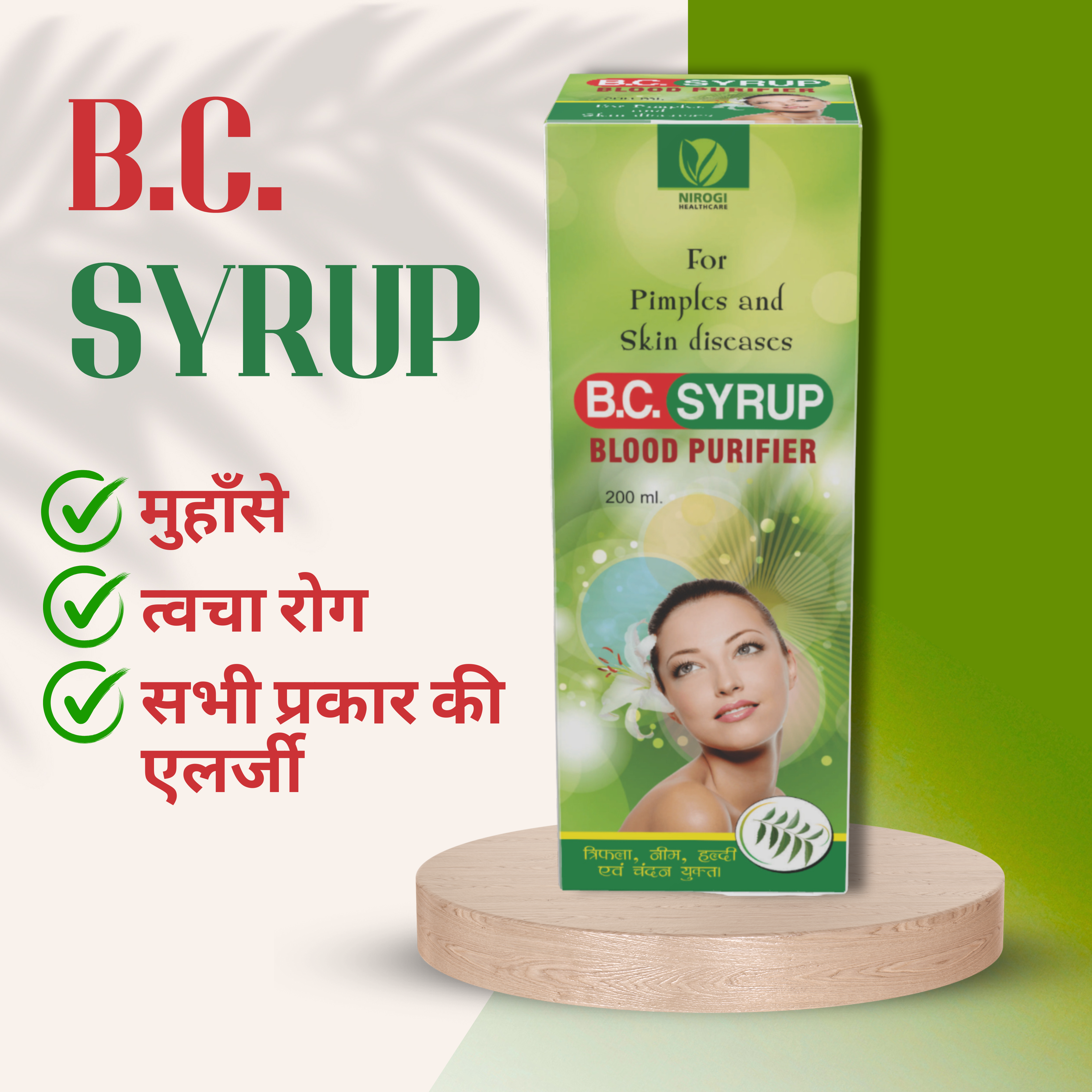 BC Syrup is an Ayurvedic proprietary medicine formulated to address skin issues, including pimples, allergies, and various skin diseases. Enriched with powerful herbal ingredients, it helps detoxify the body, purify the blood, and promote healthy, radiant skin.